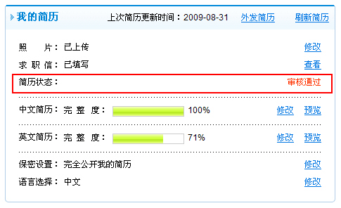 在《个人管理中心》首页可以看到当前的简历状态,如下图所示: